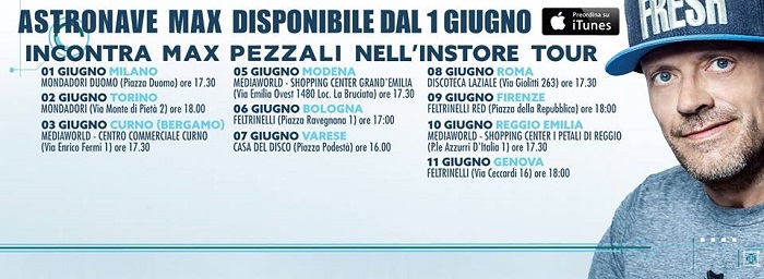 Ricordiamo che l’uscita di Astronave Max sarà accompagnata dall’instore tour che poterà Max Pezzali vicino ai suoi fans per presentare il nuovo lavoro. Ecco le date e location: