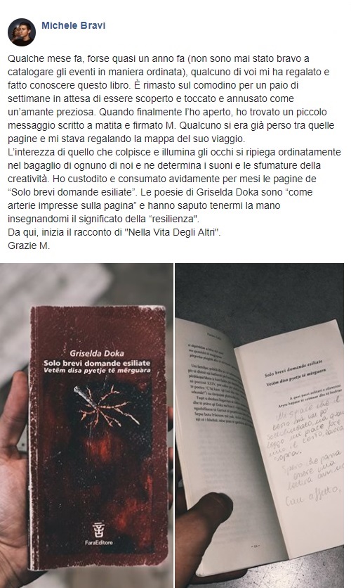 L’interezza di quello che colpisce e illumina gli occhi si ripiega ordinatamente nel bagaglio di ognuno di noi e ne determina i suoni e le sfumature della creatività. Ho custodito e consumato avidamente per mesi le pagine de “Solo brevi domande esiliate”. Le poesie di Griselda Doka sono “come arterie impresse sulla pagina” e hanno saputo tenermi la mano insegnandomi il significato della “resilienza“.