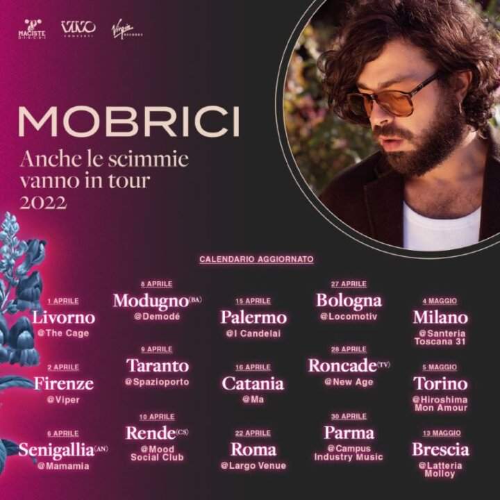 Sempre da Venerdì 1 Aprile, partendo dal The Cage di Livorno, Mobrici tornerà live con il suo ANCHE LE SCHIMMIE VANNO IN TOUR 2022. Accompagnato da una nuova formazione, ma con la stessa voglia di condividere con il pubblico il suo mondo musicale, ripercorrerà i brani più importanti e amati della sua carriera partendo dal suo primo album solista Anche Le Scimmie Cadono Dagli Alberi (Maciste Dischi/Virgin Records/Universal Music Italia)
