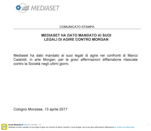 A questo punto si apprende dai profili social di Mediaset che l’azienda ha deciso di perseguire legalmente Morgan per le gravi accuse…