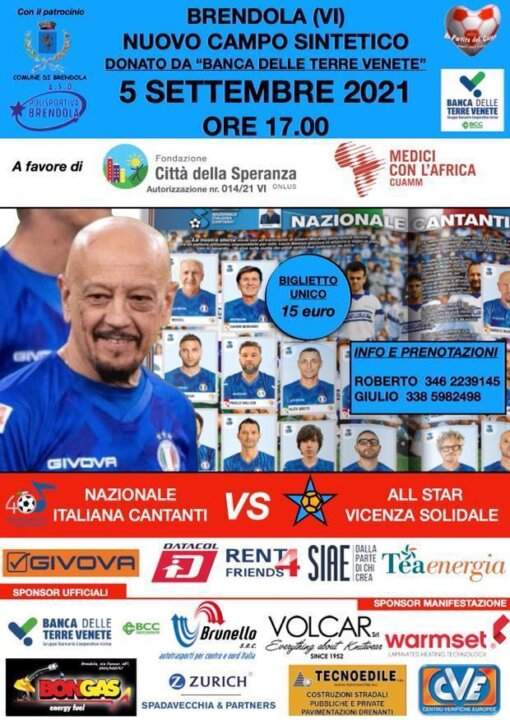 Torna domenica 5 settembre 2021 la Nazionale Cantanti che per l’occasione giocherà a partire dalle ore 17 sul nuovo campo sintetico a Brendola in provincia di Vicenza sfidando la All Star Vicenza Solidale.
