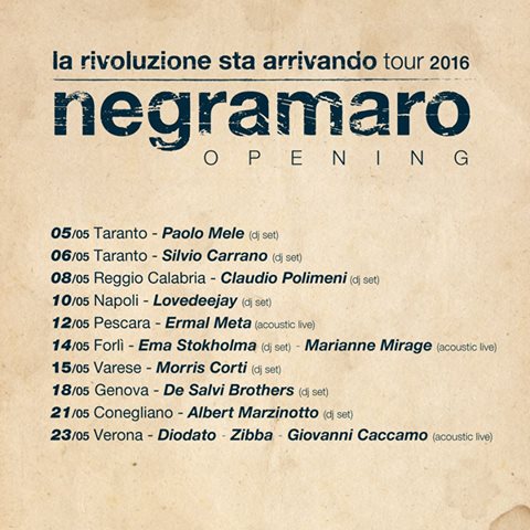 È partito ieri sera, 3 maggio, con la tappa zero di Roccaraso (L’Aquila) il nuovo tour dei Negramaro La Rivoluzione sta Arrivando Tour 2016.