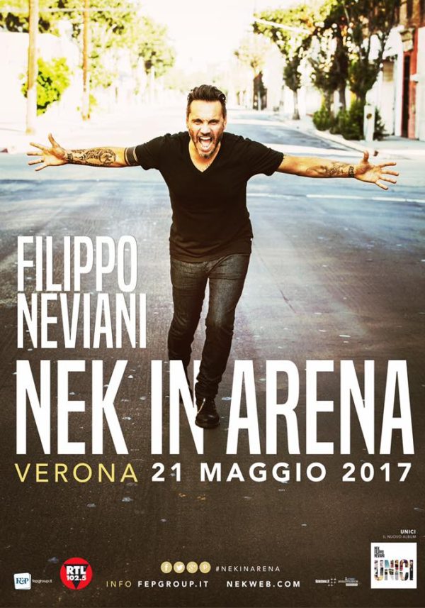 Vi ricordiamo inoltre che il prossimo 21 maggio Nek coronerà uno dei sogni della sua vita professionale, ovvero quello di suonare per la prima volta all’Arena di Verona.