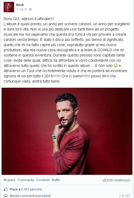 L’album è quasi pronto, un anno per scrivere canzoni, un anno per sceglierle e dare loro vita. Non si usa più dedicare così tanti mesi ad un progetto musicale ma noi sapevamo che questa era l’unica via per provare a creare canzoni senza tempo. È stato il disco più sofferto, più denso di significato, quello che mi ha fatto capire più cose, sopratutto grazie al mio nuovo produttore, alla mia nuova casa discografica e al team di GOWILD che mi sostiene in questa avventura. Durante questo periodo sono capitate tante cose, molte delle quali, difficili da affrontare e vorrò condividerle con voi attraverso tutto quello che ho scritto in questo album…. E non solo e attraverso un Tour che ho fortemente voluto e che mi porterà ad incontrare ognuno di voi per tutto il 2015!!!!!! Ora ci siamo!!!!!! posso dirvi che comunque vada, andrà tutto bene.