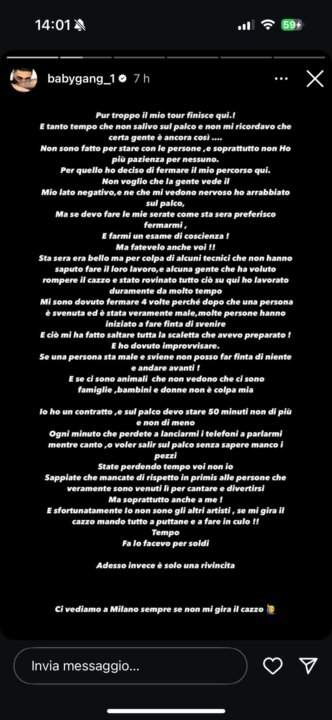 Con un lungo sfogo su Instagram, Baby Gang ha annunciato l’interruzione improvvisa del suo tour, citando vari problemi avvenuti durante una recente serata. Il rapper ha lamentato la mancanza di rispetto da parte del pubblico e il lavoro inadeguato di alcuni tecnici, che hanno portato a un’esibizione difficoltosa e all’improvvisazione. “Non voglio che la gente veda il mio lato negativo“, ha scritto, spiegando che preferisce fermarsi piuttosto che continuare in queste condizioni. Tuttavia, Baby Gang non esclude di tornare sul palco a Milano, ma solo se lo vorrà.