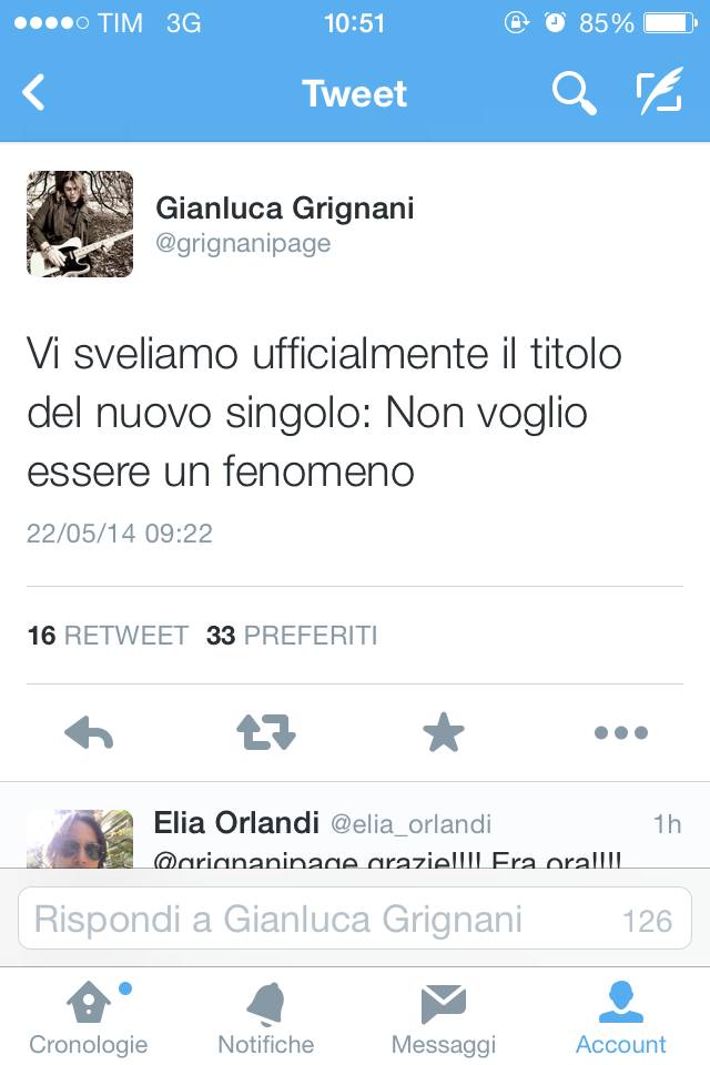 Finalmente svelato il titolo del nuovo singolo: sarà «Non voglio essere un fenomeno». Questa volta Grignani ha scelto Twitter per dare l’atteso annuncio ai suoi fan, che hanno accolto con entusiasmo la notizia.