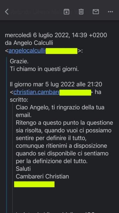 In allegato alla mail è presente la suddetta richiesta da parte di Christian Cambareri ad Angelo Calculli di un duetto tra un suo artista e Achille Lauro, e la mail a seguire in cui abbiamo censurato i dati sensibili.