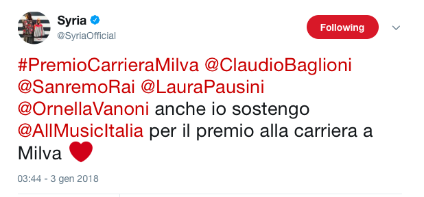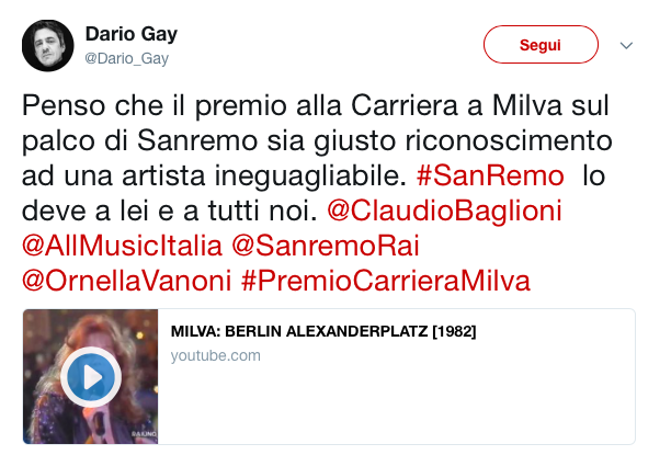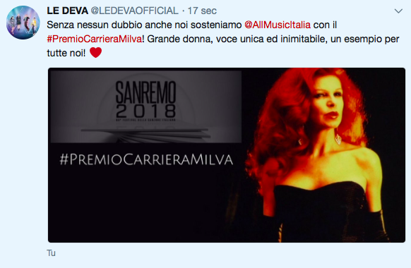 Insomma ora non resta che continuare a diffondere su Twitter l’Hashtag #PremioCarrieraMilva aspettando che Claudio Baglioni e la Commissione Rai del Festival diano un segnale in tal senso dando il giusto riconoscimento ad una donna che ha partecipato per ben 15 volte al Festival di Sanremo e che, unica in Italia, ha ricevuto le più alte onorificenze in Italia, Francia e Germania.