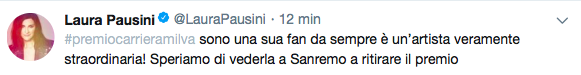 “#PremioCarrieraMilva sono una sua fan da sempre, è un’artista straordinaria! Speriamo di vederla a Sanremo a ritirare il Premio“.