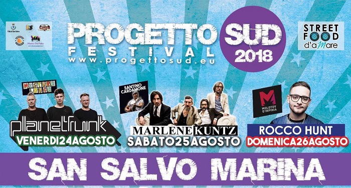 Si avvicina l’appuntamento con la quinta edizione di Progetto Sud Festival, l’evento che riunirà a San Salvo Marina (Ch) numerosi artisti della scena nazionale e non solo. Per questa nuova edizione sono stati invitati Rocco Hunt, Planet Funk, Marlene Kuntz, Mistura Louca, Santino Cardamone e Motolov d’Irpinia, in un mix musicale in grado di accontentare tutti i gusti.