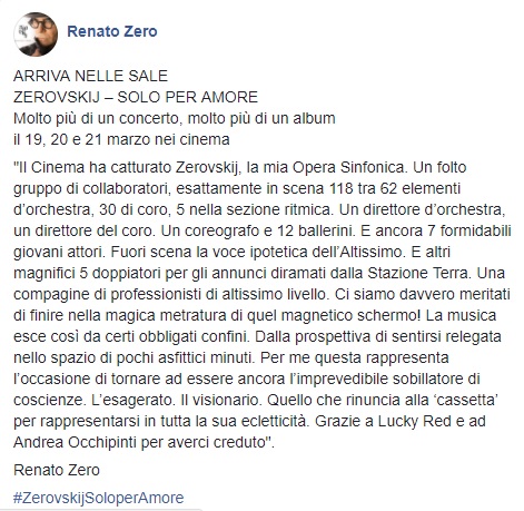 “Il Cinema ha catturato Zerovskij, la mia Opera Sinfonica. Un folto gruppo di collaboratori, esattamente in scena 118 tra 62 elementi d’orchestra, 30 di coro, 5 nella sezione ritmica. Un direttore d’orchestra, un direttore del coro. Un coreografo e 12 ballerini. E ancora 7 formidabili giovani attori. Fuori scena la voce ipotetica dell’Altissimo. E altri magnifici 5 doppiatori per gli annunci diramati dalla Stazione Terra. Una compagine di professionisti di altissimo livello. Ci siamo davvero meritati di finire nella magica metratura di quel magnetico schermo! La musica esce così da certi obbligati confini. Dalla prospettiva di sentirsi relegata nello spazio di pochi asfittici minuti. Per me questa rappresenta l’occasione di tornare ad essere ancora l’imprevedibile sobillatore di coscienze. L’esagerato. Il visionario. Quello che rinuncia alla ‘cassetta’ per rappresentarsi in tutta la sua ecletticità. Grazie a Lucky Red e ad Andrea Occhipinti per averci creduto“.