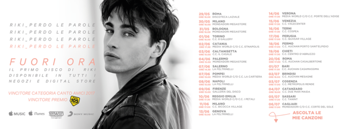 Adesso, visto il grande riscontro di pubblico ottenuto da Riki la sua casa discografica, la Sony Music Italia, e l’agenzia tour che lo segue nei live, la F&P Group, hanno deciso di fissare i primi due grandi appuntamenti live del ragazzo.