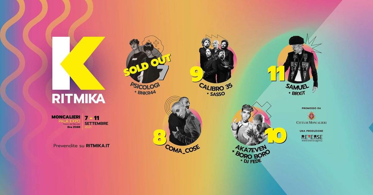 Mercoledì 8 settembre salgono sul palco di Ritmika i Coma_Cose. Dal PalaExpo di Moncalieri parte il Nostralgia Tour del duo (Fausto Lama e California). Coppia prima nella vita e poi nella musica, i Coma_Cose hanno partecipato al Festival di Sanremo con Fiamme negli occhi, certificato disco di platino.