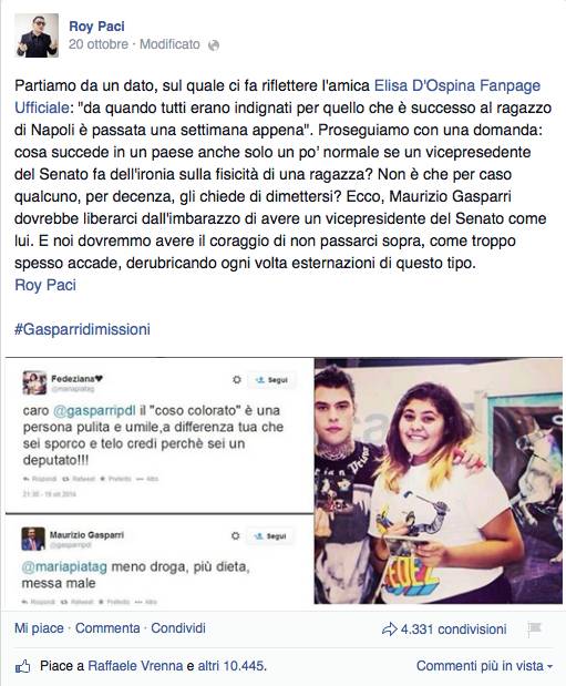 “Partiamo da un dato, sul quale ci fa riflettere l’amica Elisa D’Ospina Fanpage Ufficiale: “da quando tutti erano indignati per quello che è successo al ragazzo di Napoli è passata una settimana appena”. Proseguiamo con una domanda: cosa succede in un paese anche solo un po’ normale se un vicepresedente del Senato fa dell’ironia sulla fisicità di una ragazza? Non è che per caso qualcuno, per decenza, gli chiede di dimettersi? Ecco, Maurizio Gasparri dovrebbe liberarci dall’imbarazzo di avere un vicepresidente del Senato come lui. E noi dovremmo avere il coraggio di non passarci sopra, come troppo spesso accade, derubricando ogni volta esternazioni di questo tipo”.