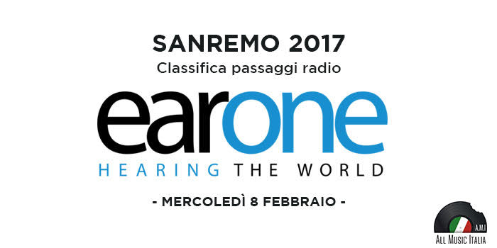 All Music Italia in collaborazione con EarOne – partner dell’industria musicale italiana che si occupa dell’elaborazione in tempo reale delle classifiche Airplay, della visualizzazione delle playlist di Radio e TV e della ricerca dettagliata sulla trasmissione dei brani – riporta la classifica dei brani più trasmessi in Radio all’indomani della prima serata di Sanremo 2017.