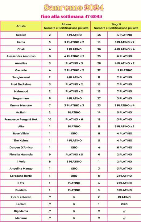 Ecco la tabella riepilogativa con il numero di Album e Singoli certificati per ciascun artista in gara e la più alta certificazione raggiunta fino ala settimana 27/2023.