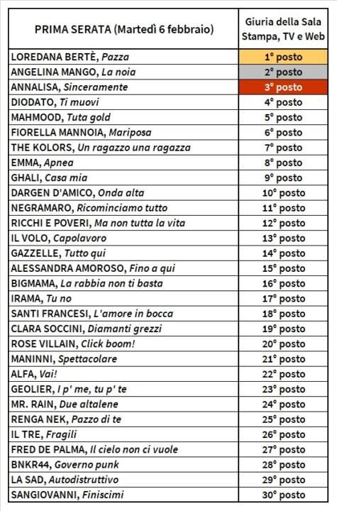A ottenere la prima posizione è stata Loredana Bertè, che ha rispettato le previsioni dei pre-ascolti e preceduto altre due favorite della vigilia come Angelina Mango e Annalisa (fin da subito, dunque, ampiamente apprezzate dai giornalisti). Completano la prima top5 letta al termine della prima serata Diodato e Mahmood.