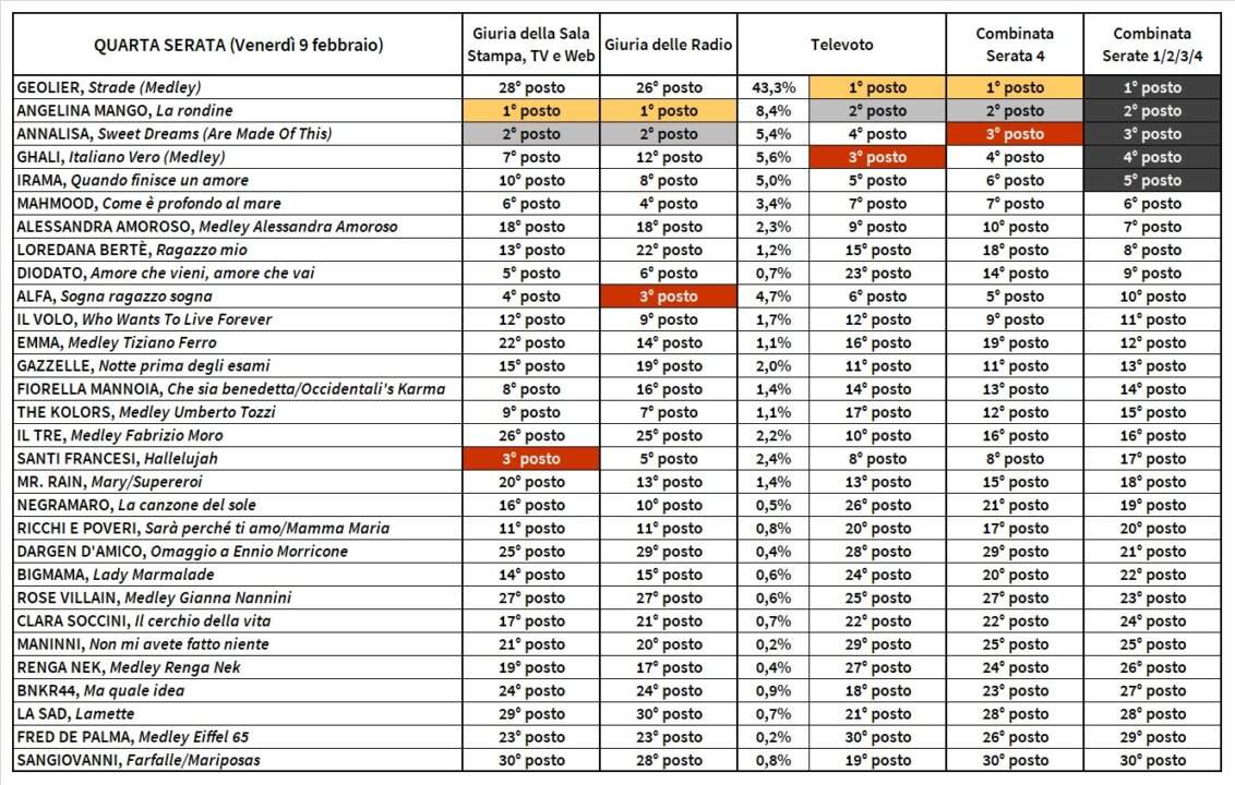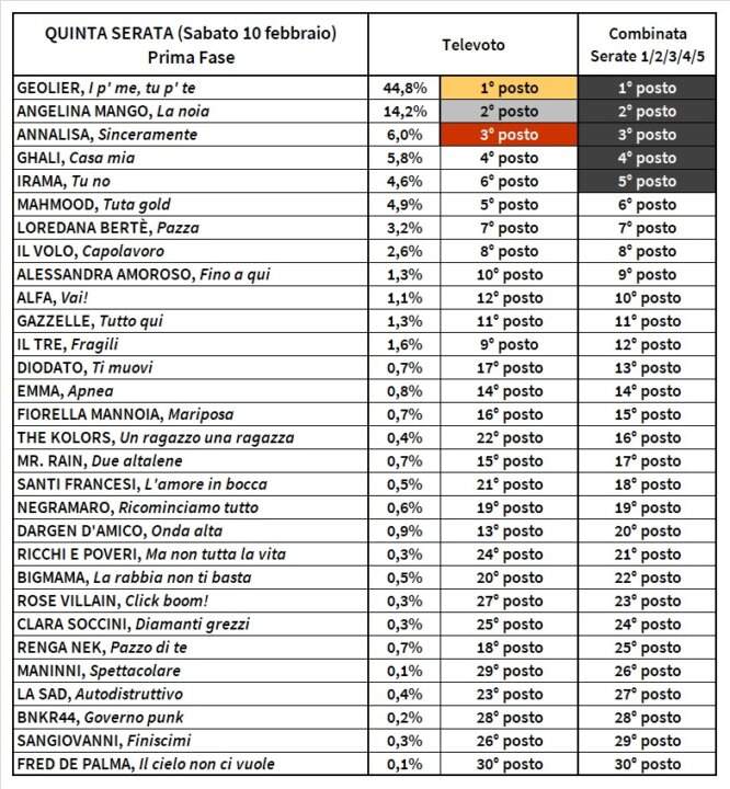 Subito fuori dai cinque si sono fermati Fiorella Mannoia, i The Kolors ed Emma, seguiti da Ghali (la cui corsa alla super finale è iniziata con un 9° posto) e Dargen D’Amico. Gli altri due eventuali superfinalisti hanno ottenuto posizioni molto meno lusinghiere: Irama si è fermato in 17° posizione, Geolier addirittura in 23° assoluta.