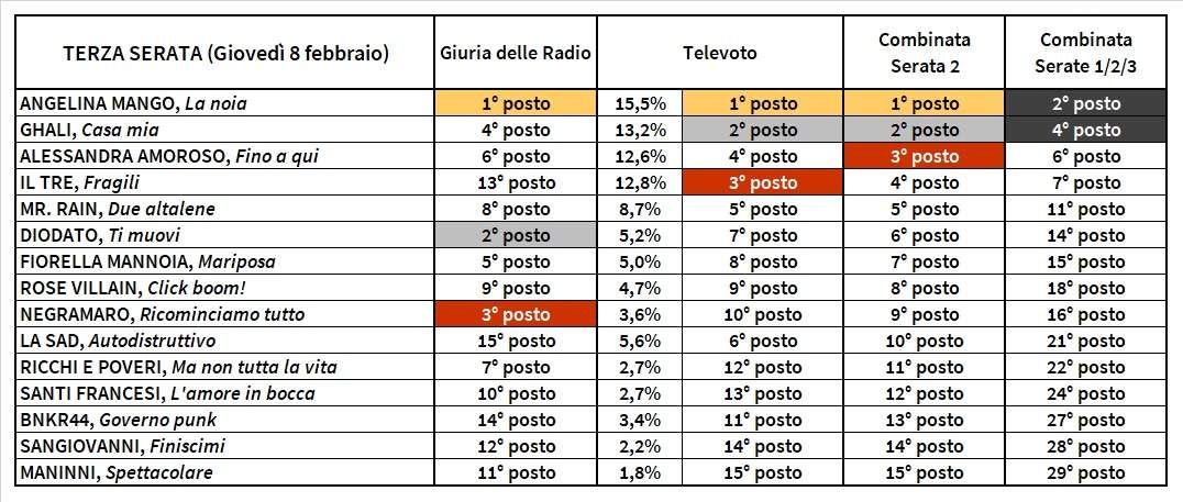 Angelina vince la serata senza particolari problemi, conquistando il primo posto sia della classifica delle radio che di quella del televoto, ma il suo vantaggio su Ghali con il pubblico votante è decisamente esiguo (15,5% contro 13,2%).