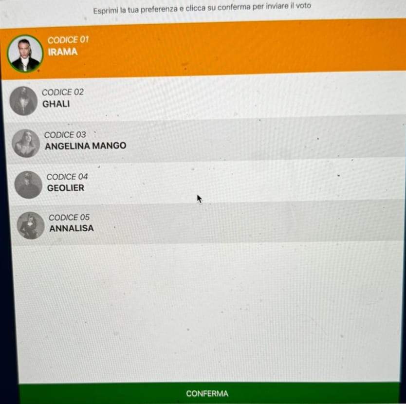 Per questo motivo a seguire trovate i voti espressi nella prima serata (voto della sola sala stampa), nella quarta serata (stampa, radio e televoto) e nella finale (stampa, radio e televoto solo nella sfida finale a cinque).