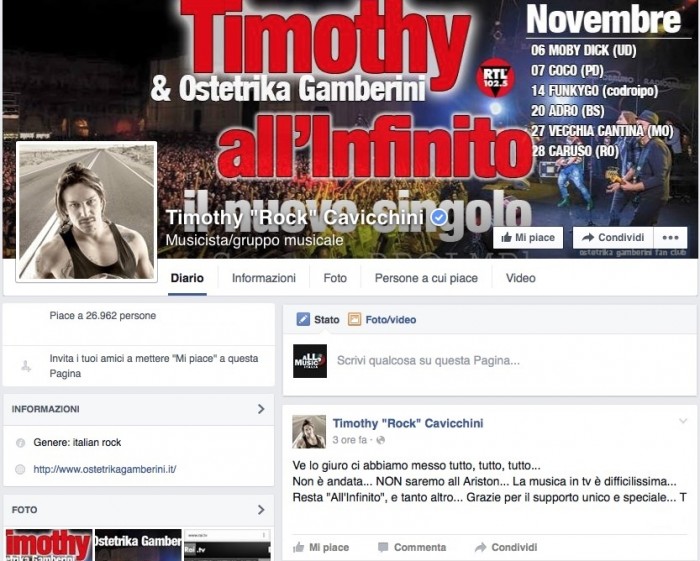 A quanto pare, però, quest’oggi potrebbe esserci stata una fuga di notizie. Altrimenti, non si spiegherebbe come uno dei 61 concorrenti in gara, Timothy Cavicchini, secondo classificato nella prima edizione di The Voice of Italy e oggi sotto etichetta Baraonda, abbia potuto lasciare questo eloquente messaggio ai suoi fan tramite la sua pagina Facebook ufficiale: