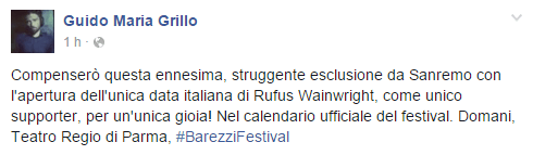 Si chiude una porta, si apre un portone per Guido Maria Grillo, scelto per aprire la data italiana di Rufus Wainwright; annunciato novità a breve termine Dinastia, Luca Mele e Simone Perrone.