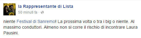 Laconico Madh che si sbilancia con una semplice emoticon, il simbolo della pace creato da Gerard Holtom. C’è chi invece, come La Rappresentante di Lista, lancia battutine un po’ sarcastiche e a farne le spese è la sempre chiacchieratissima Laura Pausini. Gli unici ad augurare fortuna ai fortunati 12 sono i Cantiere 164 e Lelio Morra.