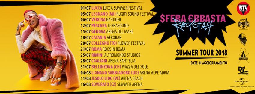 Domenica 1 luglio Sfera Ebbasta sarà al Lucca Summer Festival, manifestazione che inizierà il 23 giugno e finirà il 26 luglio. Tra i nomi degli artisti coinvolti ci sono: Caparezza (27 giugno), Ringo Starr (8 luglio), Max-Nek-Renga (14 luglio) e Gianni Morandi (22 luglio).