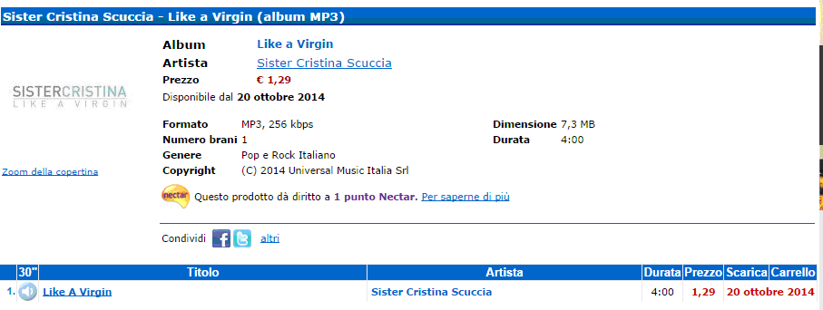 Ci rimane solo un sottilissimo dubbio (quasi inesistente a dir la verità). L’album di Sister Cristina dovrebbe essere un disco di cover con due inediti… quindi c’é anche la remota possibilità che il brano sia un inedito, ma per ora crediamo proprio che si tratti di una cover del famosissimo brano di Madonna.