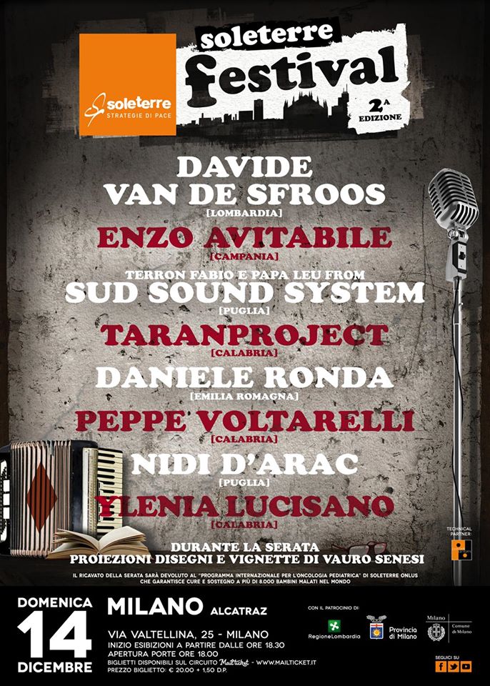 Il presidente di Soleterre Damiano Rizzi ha descritto con queste parole lo show del 14 dicembre organizzato dalla sua associazione: “Il Soleterre Festival è per noi una grande occasione non solo per raccogliere fondi per i nostri progetti umanitari, ma soprattutto per affermare, attraverso la cultura e la musica, i diritti umani fondamentali. La musica folk è una musica che ha profonde radici in tutte le regioni italiane, ma anche in tutti i Paesi del mondo. Queste culture non solo possono convivere, ma possono arricchirsi reciprocamente. La collaborazione tra il mondo della solidarietà, che lavora in Paesi in cui la privazione dei diritti è quotidiana, e gli artisti che partecipano al concerto ci permette di lanciare questo forte messaggio: le radici, se condivise, diventano ali”.