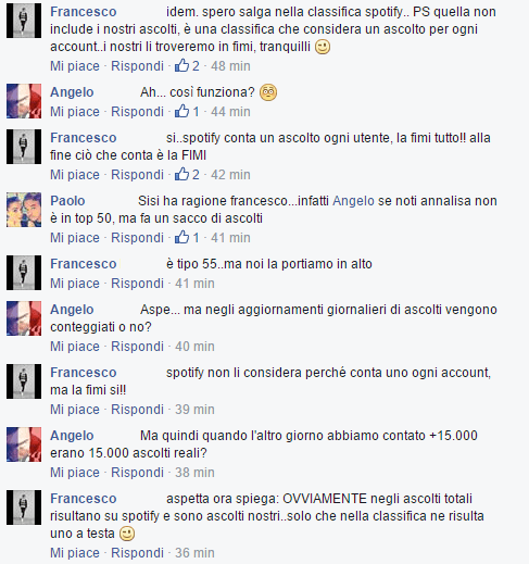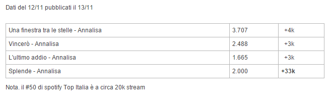 Dopo aver contattato personalmente Spotify Italia e FIMI, rimaniamo a disposizione (anche di GFK) per qualsiasi tipo di risposta e delucidazione e specifichiamo, qualora ce ne fosse bisogno, che non vuole essere in nessun modo un articolo accusatorio nei confronti di Annalisa o qualsiasi altro artista italiano, ma bensì utile per la musica italiana e tutti gli appassionati per spiegare nel dettaglio come funzionano questi servizi.