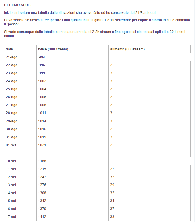 L’analisi etica la lascio a voi, mi sembra logica ma io sono più dal lato dei numeri e dei processi. Certamente ribadisco che mi risulta strana una cosa: ad analizzare i dati totali dei brani e quelli delle classifiche quotidiane, sembra che Spotify abbia due contatori diversi all’interno della stessa nazione. Io invece mi aspetto che Spotify abbia un contatore univoco per paese, e tramite questo mandi poi i dati alle FIMI di turno per i calcoli delle posizioni in classifica e delle certificazioni.
