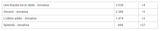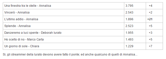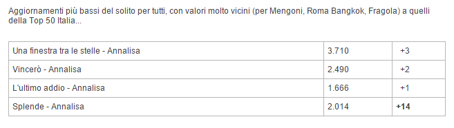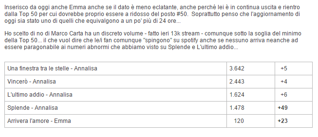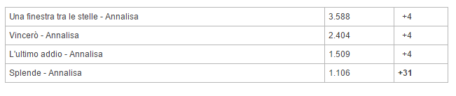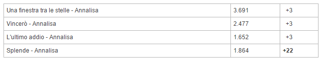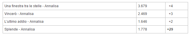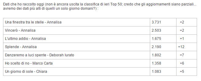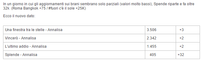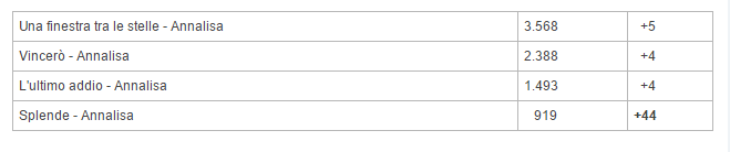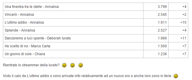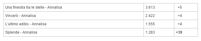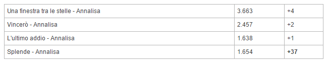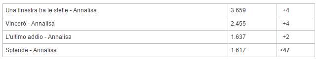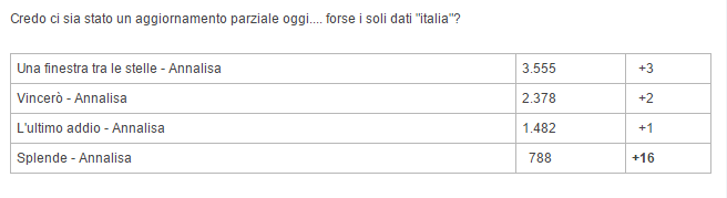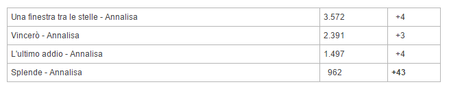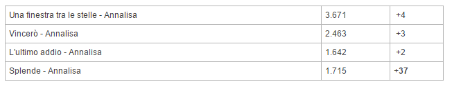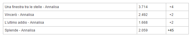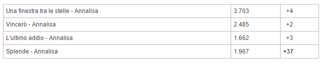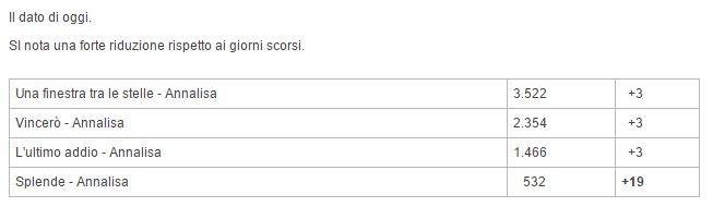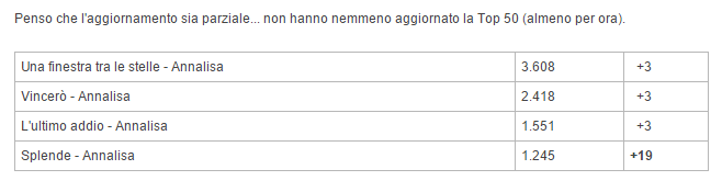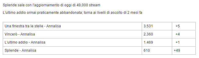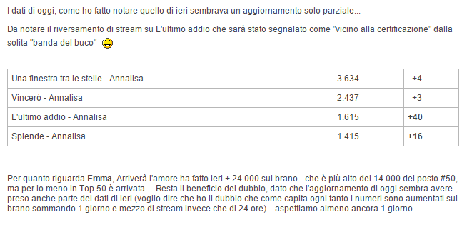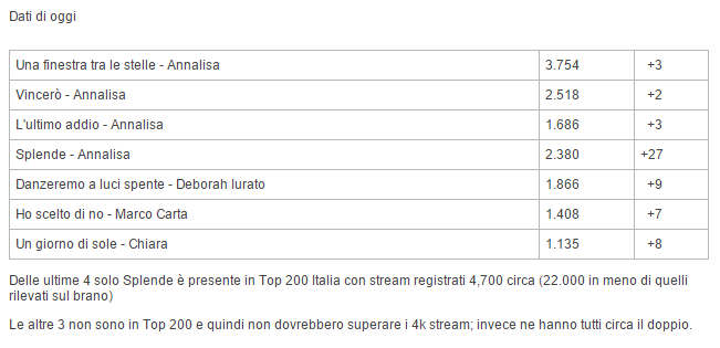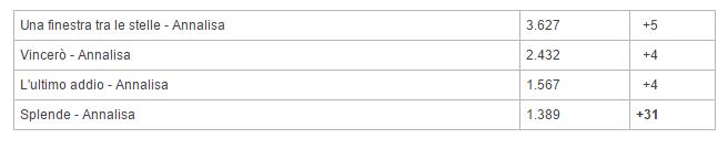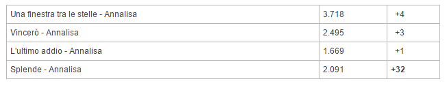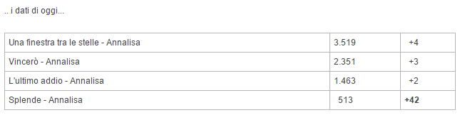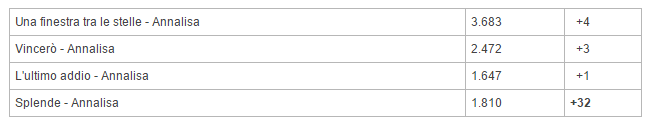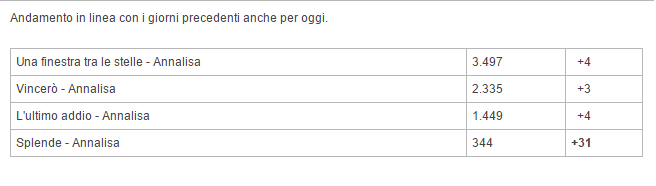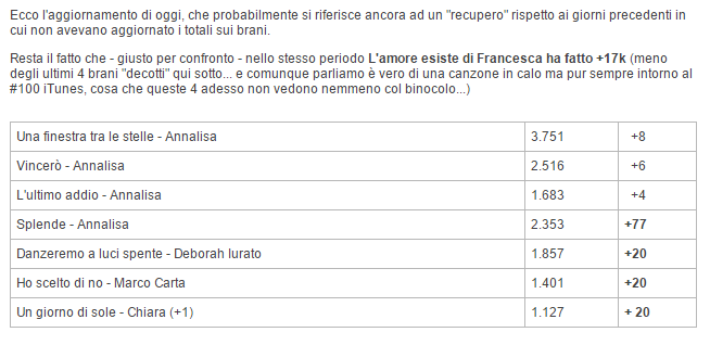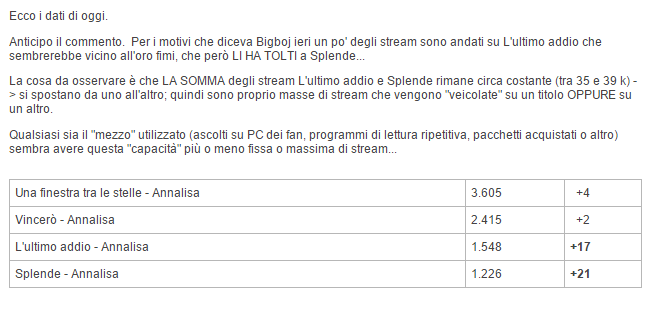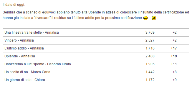 Ti dirò, ci sono altri brani, non di Annalisa (sul forum Reality House si citano Ho scelto di no di Marco Carta, Un giorno di sole di Chiara e Danzeremo a luci spente di Deborah Iurato, ndi), che hanno avuto delle oscillazioni decisamente inferiori, circa un quarto dell’effetto Annalisa. Vedremo se riusciranno ad arrivare pian piano alla certificazione.