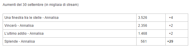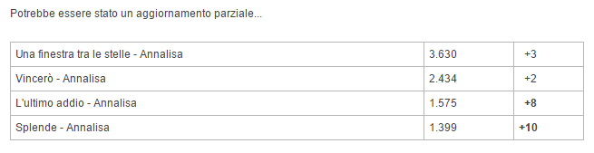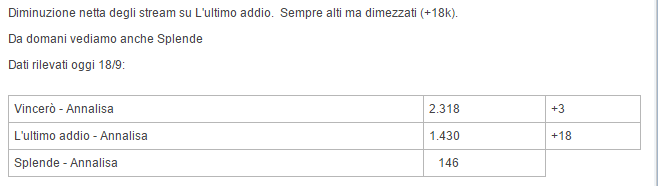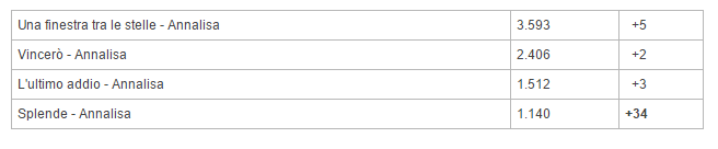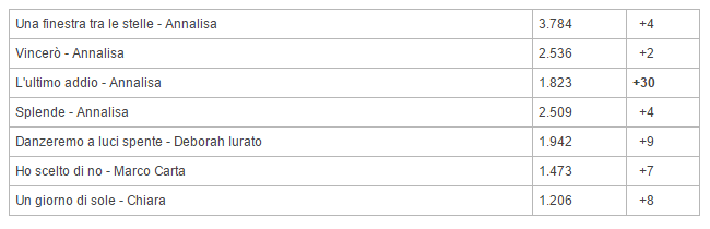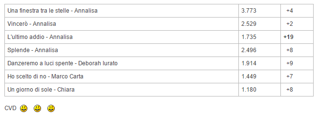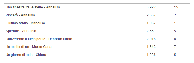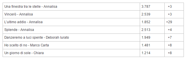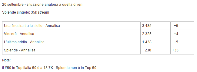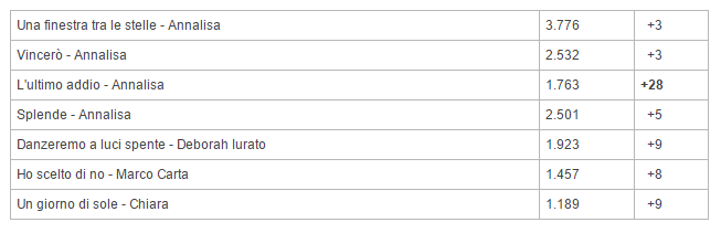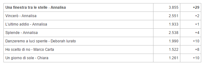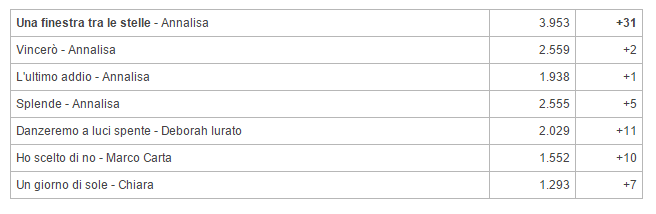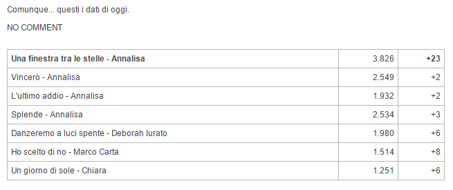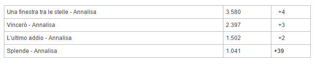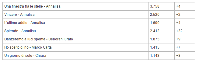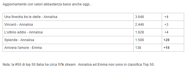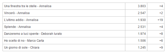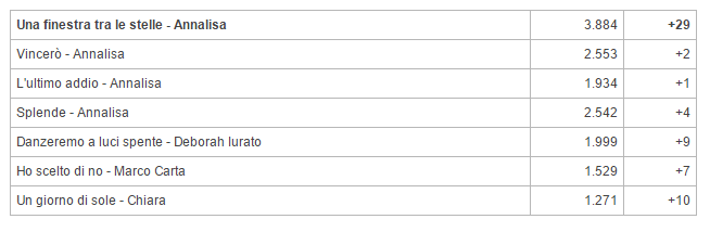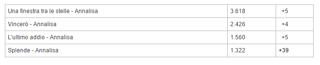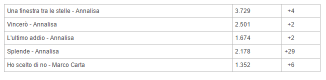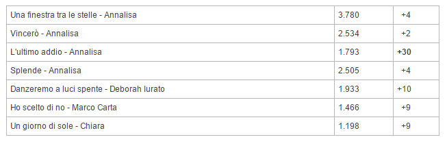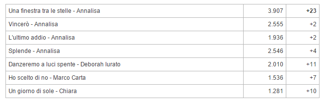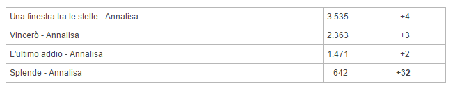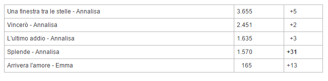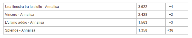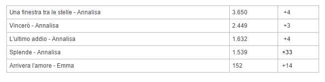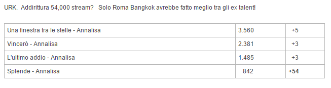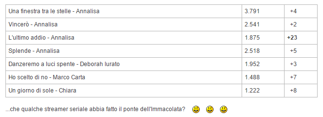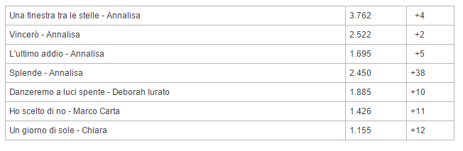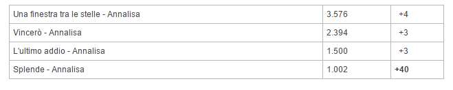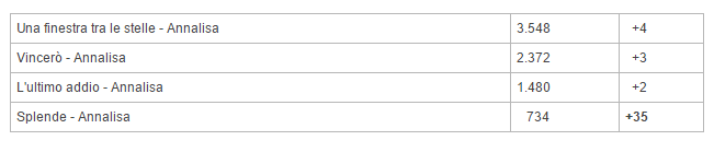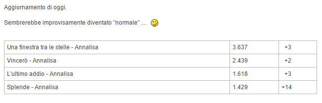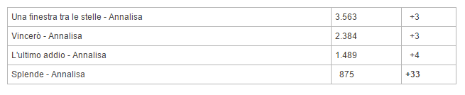 Ti dirò, ci sono altri brani, non di Annalisa (sul forum Reality House si citano Ho scelto di no di Marco Carta, Un giorno di sole di Chiara e Danzeremo a luci spente di Deborah Iurato, ndi), che hanno avuto delle oscillazioni decisamente inferiori, circa un quarto dell’effetto Annalisa. Vedremo se riusciranno ad arrivare pian piano alla certificazione.