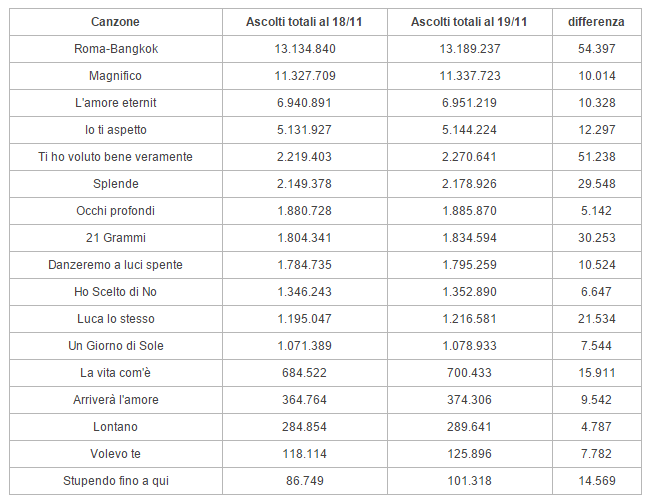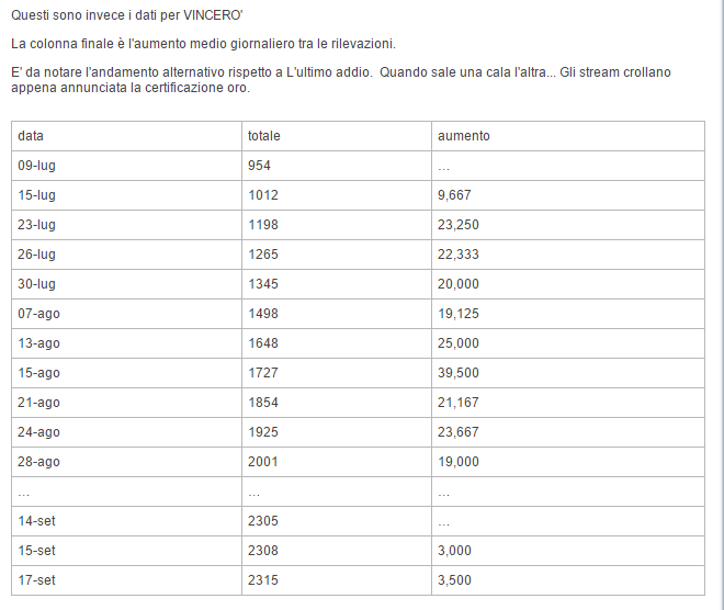 Cosa ancora più sospetta è che quando “Vincerò” ha ottenuto il disco d’oro digitale, in poche ore gli ingenti numeri di streaming si sono spostati in massa “Splende”e successivamente su”L’ultimo addio”. Entrambi poi certificati anch’essi con il disco d’oro.