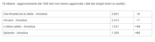Gli ingenti ascolti all’estero di Annalisa si possono ora escludere perché da qualche tempo Spotify, che nel tempo cambia e migliora i suoi parametri, permette di vedere per singolo artista le cinque aree geografiche (città o province) in cui vi sono più ascolti dei propri brani. Mentre per Baby K (grazie a Roma Bangkok), Il Volo, Marco Mengoni o Alessandra Amoroso appaiono in top 5 anche città prevalentemente spagnole o sudamericane, con Annalisa questo non accade. Le sue città sono i soliti grandi centri del nostro paese: Milano, Roma, Torino, Firenze, Bologna ecc.