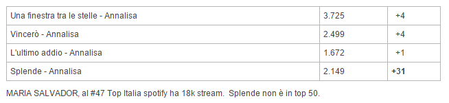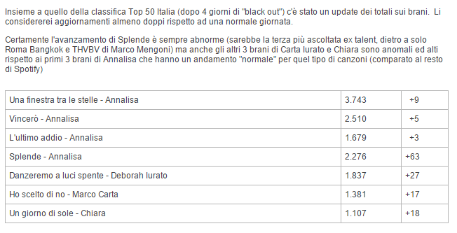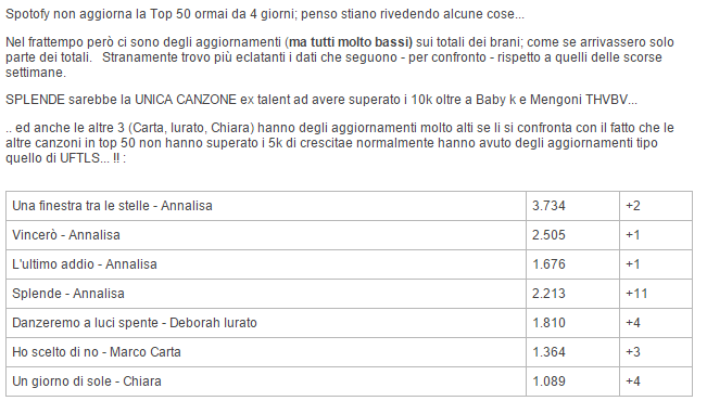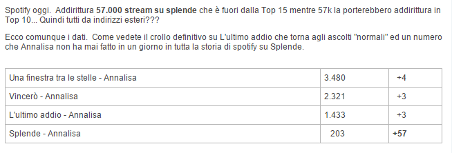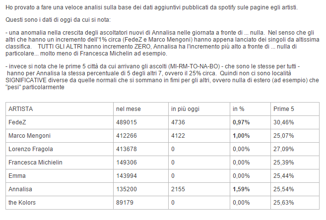 Sì, ho visto anch’io questo topic. I dati sono abbastanza chiari ed eclatanti: un utente ha preso in considerazione Splende di Annalisa confrontandola con Magnifico di Fedez e Francesca Michielin. Nel periodo analizzato il duetto è stato sistematicamente e ampiamente davanti sia su Spotify che su iTunes, mentre il singolo di Annalisa addirittura non compariva né in top 100 su iTunes né in top 50 su Spotify, eppure a un certo punto nella classifica ufficiale singoli redatta da FIMI / Gfk è sbucata improvvisamente Splende e diverse posizioni più in alto di Magnifico.