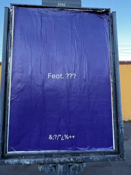 I primi nomi sono infatti quelli di Rkomi, Rondodasosa, Coez e della band più pop del panorama musicale italiano, i Pinguini Tattici Nucleari (che non si sciolgono!). A questi tre se ne aggiunge un altro, l’unico cartellone in cui il nome dell’artista coinvolto non è riportato ma semplicemente troviamo la scritta feat. ??? (lo vedete qui sotto). Che sia una collaborazione internazionale? E sopratutto, sono solo questi quattro i cartelloni o altri ci sfuggono al momento?