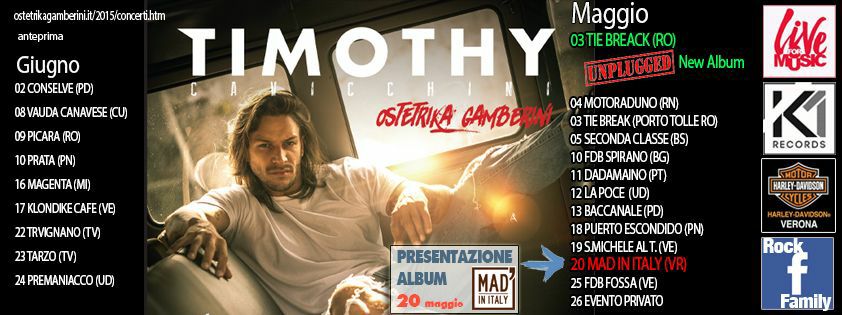 Timothy da anni non manca di far sentire la sua presenza nel mercato discografico. Fin dai tempi della band AenneDi, l’artista veronese ha sempre dato l’impressione di avere un’attitudine rock unita ad una forte propensione al mainstream. In molti ricordano la sua partecipazione e il secondo posto conquistato nella prima edizione del talent tv The Voice Of Italy dove militava nella squadra di Piero Pelù e a cui seguì la pubblicazione dell’Ep A Fuoco con Universal Music.
