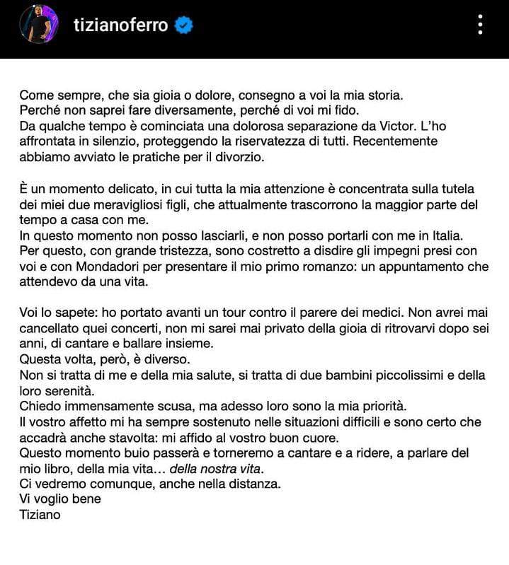 Queste le parole di Tiziano Ferro condivise sui social questa mattina (19 settembre):