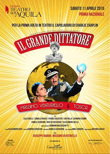 “Nel Grande dittatore, il protagonista si fa letteralmente in due. Da una parte c’è il piccolo ebreo che fa il barbiere nel ghetto in cui il nazismo lo ha richiuso e dall’altra c’è il feroce dittatore al quale egli assomiglia tanto da finire con l’assumerne il ruolo, rovesciandone nel messaggio radiofonico finale la violenza in pacifismo. Con quel film, Chaplin ridiede coraggio al mondo avvolto dalla follia e dal crimine. E lo fece grazie alla risata, che ora viene riproposta sul palcoscenico da Massimo Venturiello, il quale sottolinea: «Non è un’idea dettata dalla presunzione decidere di confrontarsi con un progetto di siffatta portata. Ciò che mi tranquillizza è proprio il Teatro, quello vero, che non insegue paragoni, ma solo la sua peculiare comunicazione che lo distingue da qualsiasi altra forma artistica. C’è quindi da tremare di fronte al genio di Chaplin allo stesso modo con cui c’è da tremare di fronte al genio di Shakespeare; l’approccio creativo di uno spettacolo teatrale, a mio avviso, deve essere lo stesso». Aggiunge Venturiello: «Forse la domanda più spinosa è il modo in cui interpretare un ruolo, anzi due, che sono diventati un’icona del talento e della mimica chapliniana. Ma anche in questo il Teatro mi viene in aiuto. Ho sempre creduto che il compito di un attore sia quello di ascoltare ciò che accade intorno a sé sulla scena; sono le parole dei tuoi interlocutori a dare vita alle tue, sono le azioni altrui che determinano le tue, soprattutto ciò che accade in scena è il risultato di chi è in scena e ciò che inventeremo e abiteremo sarà un’altra cosa dal film. Ciò che invece preme di non perdere è l’ironia, il sarcasmo e l’irresistibile comicità» di un testo nella cui messa in scena la musica sarà l’altro grande protagonista: sia quella composta da Germano Mazzocchetti ispirandosi ora al suono degli ebrei e ora a quello dei tedeschi; sia quella garantita dalla presenza in locandina di un’attrice-cantante quale Tosca.” (Fonte: www.teatrostabilegenova.it)