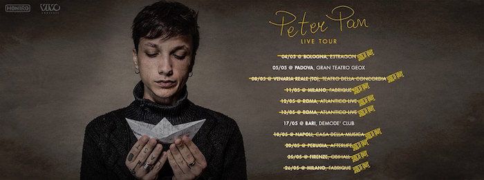 Il Peter Pan Tour 2018 inizierà a maggio, ma già adesso per dieci delle dodici date non ci sono più biglietti. In un giorno, sono andate sold out le tappe di Bologna, Torino e la seconda data di Milano al Fabrique. Solo per Bari e Padova sono rimasti gli ultimi posti disponibili.