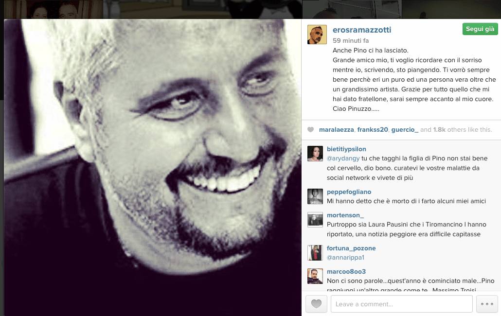 All’inizio si pensava all’ennesima bufala, una di quelle notizie idiote che purtroppo nell’epoca dei social vengono messe in rete di continuo per poi essere smentite, ma poi la conferma è arrivata da Eros Ramazzotti che tramite un messaggio sul suo profilo Instagram ha dato la triste notizia.
