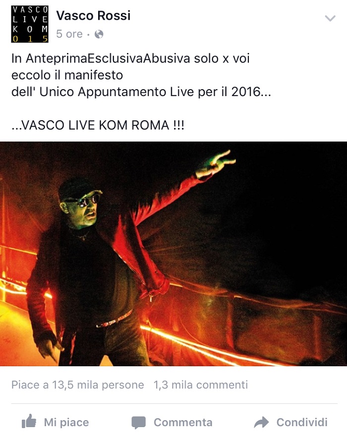 Così, alle prime luci dell’alba, Vasco Rossi comunica ai suoi numerosissimi fan, l’unico concerto previsto per il 2016 e dà appuntamento a tutti a Roma pubblicando la foto che andrà a costituire il manifesto di questo che già sappiamo sarà un grande evento live del Blasco.