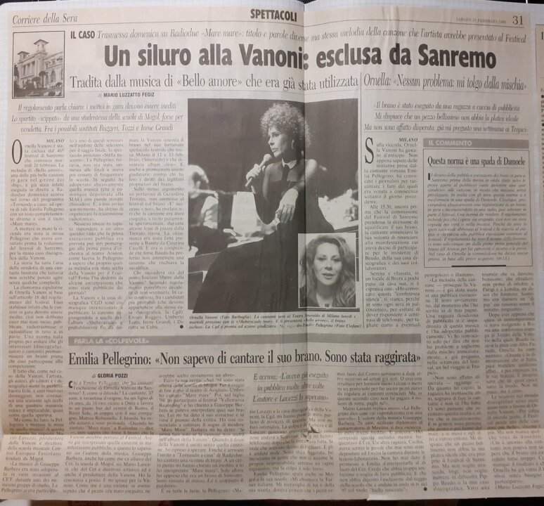 Cercando tra il “mio archivio storico” ho ritrovato un articolo del Corriere delle Sera del 10 febbraio 1996 in cui Mario Luzzatto Fegiz raccontò l’esclusione. Ornella Vanoni fu sostituita da Enrico Ruggeri.