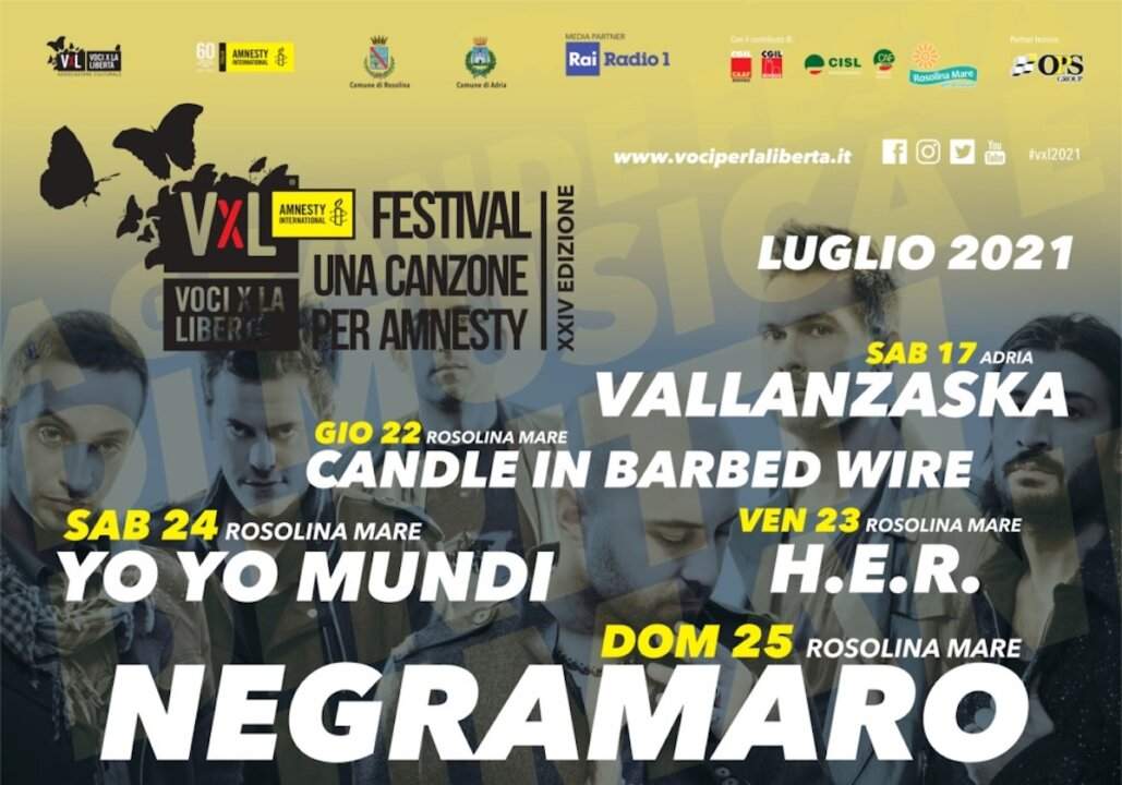 Voci per la libertà – Una canzone per Amnesty unisce musica e diritti umani. Quest’anno, il Festival giunge alla sua 24ma edizione e celebra i 60 anni di Amnesty International. Il programma prevede un’anteprima il 17 luglio 2021 ad Adria; e poi quattro giorni di eventi dal 22 al 25 luglio a Rosolina Mare.