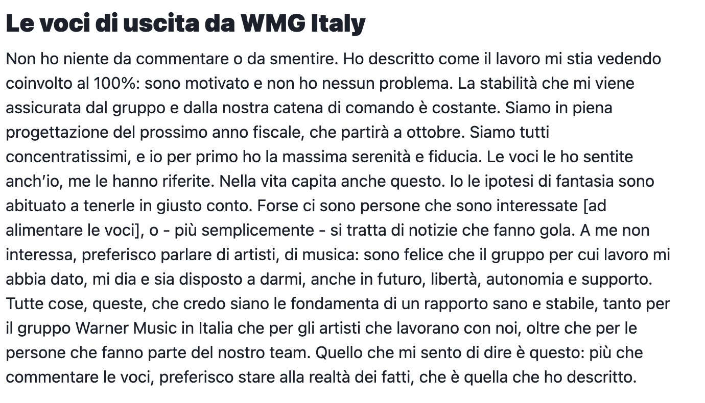 Giusto qualche giorno dopo Alboni rilasciava un’intervista agli amici di Rockol per raccontare i grandi risultati raggiunti da Warner Music nell’ultimo periodo e cogliendo l’occasione per rispondere “alle ipotesi di fantasia” messe in giro dal nostro sito: