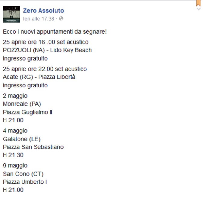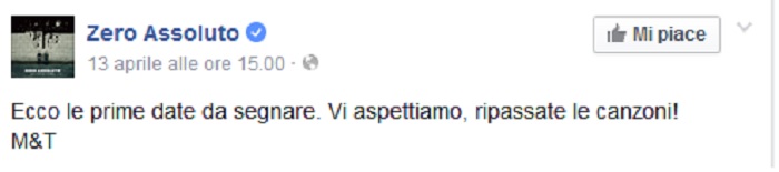 Gli Zero Assoluto, qualche giorno fa annunciando le prime date dei loro concerti, postavano su Facebook: