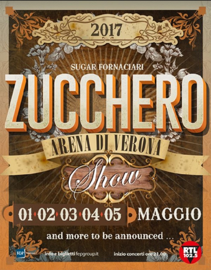 Zucchero ritornerà all’Arena di Verona i giorni 1, 2, 3, 4 e 5 maggio con cinque imperdibili live… e come indicato nella locandina, potrebbe non finire qui …and more to be announced!