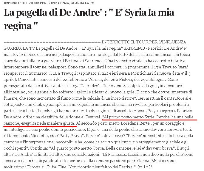 Un ricordo bellissimo, all’indomani della mia esibizione al festival, fu un articolo su Il Corriere della Sera che custodisco ancora gelosamente… Fabrizio De André, che era rimasto a casa dal tour per problemi di salute, stilava le sue pagelle sulle donne in gara a Sanremo e spese parole bellissime ed indimenticabili per me, che conservo ancora nel mio cuore…